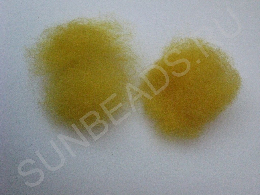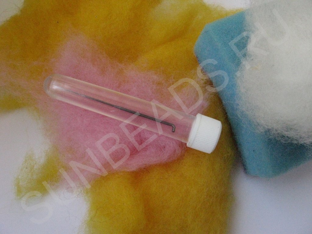 Количество шерсти определяется граммами. Этот зайчишка весит 15 гр, но лучше когда материал есть с запасом. Цвет выбирается произвольный. В данном случае это будет солнечный желтый зайка. Нужно немного розового, чтобы выделить лапки и ушки. Белый для формирования мордочки. Фелтинговая игла звездочка № 38, губка для мойки посуды. Понадобятся также ножницы, бусинки или бисер, тонкая игла для бисера, нитка в цвет.