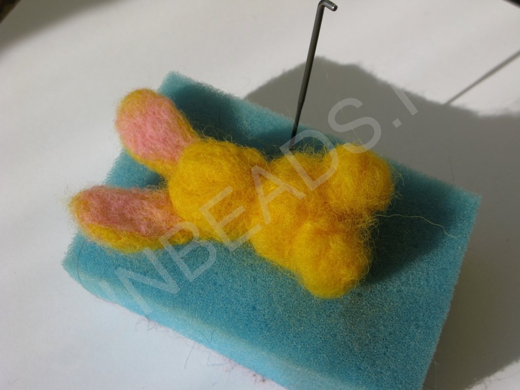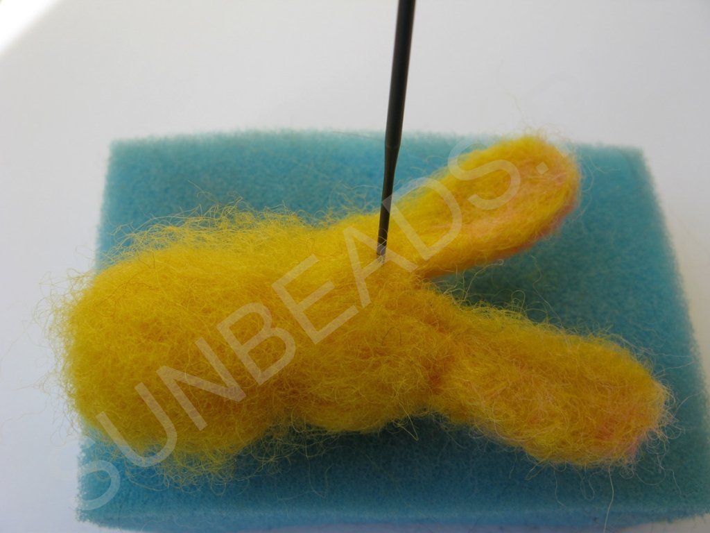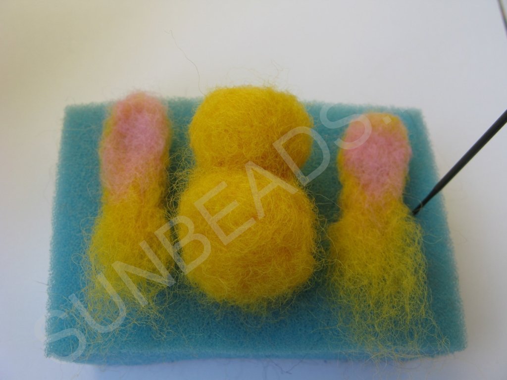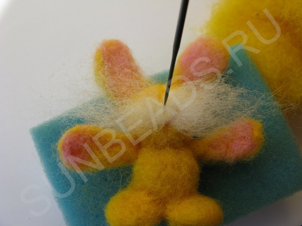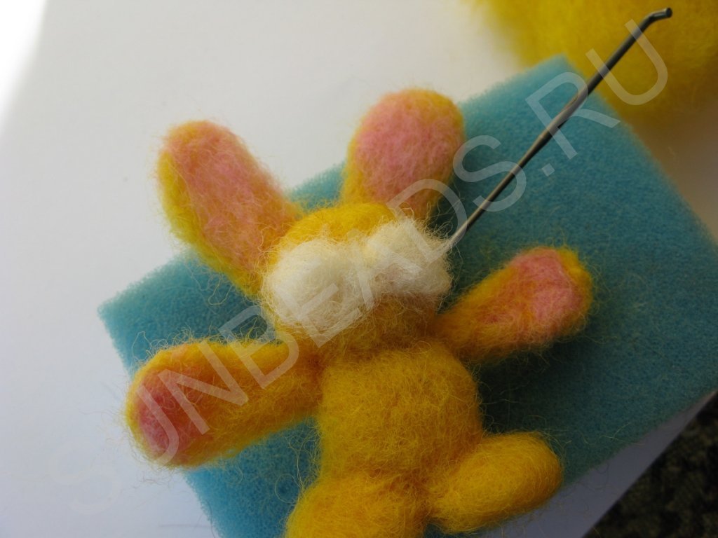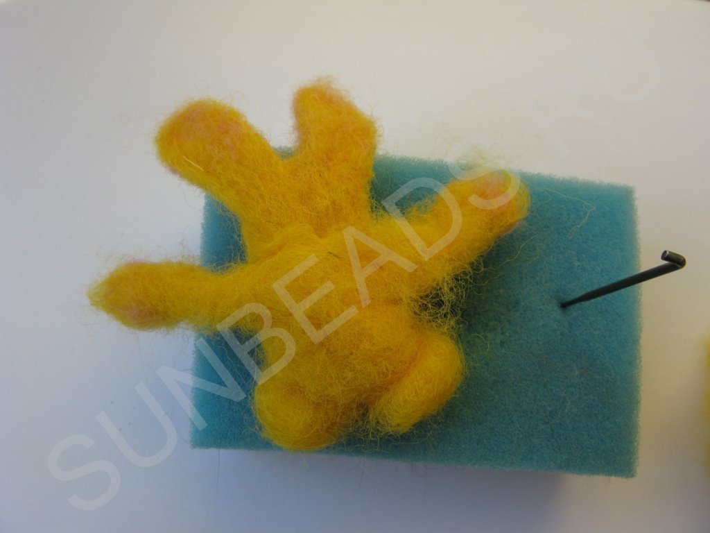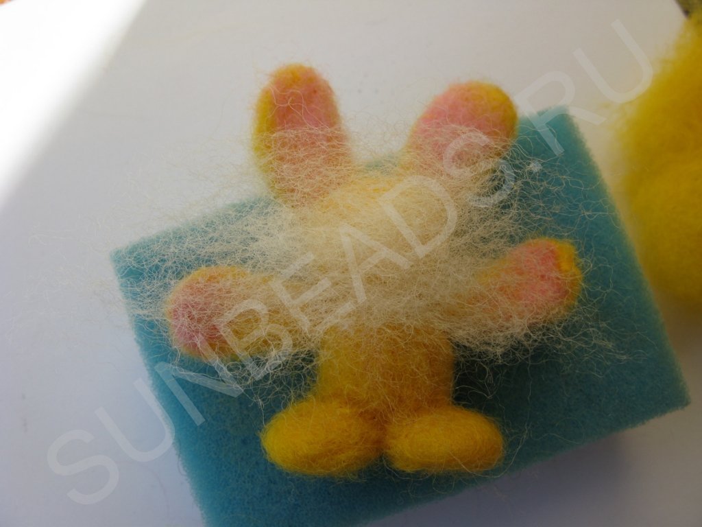 Шерсть прикладывается к тому месту, где предполагается сделать лапки. Делается несколько уколов иглой глубоко по центру выбранного места. Затем аккуратно формируются небольшие неплотные шарики. Окончательная доработка лап производится позже.