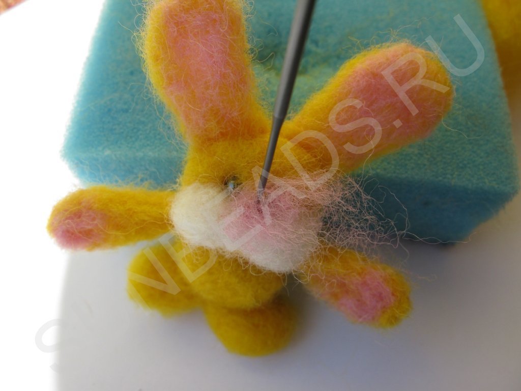 После этого формируется мордочка. Все белые волокна аккуратно иголкой заправляются внутрь.