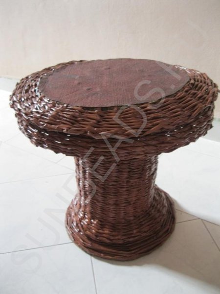 Изделие готово. Такой предмет может оказаться очень полезным для рукодельницы: хранить нитки, материалы или различные приспособления в «животе» столика очень удобно. В данном мастер-классе столик нашел свое место рядом с парой оплетенных кресел.