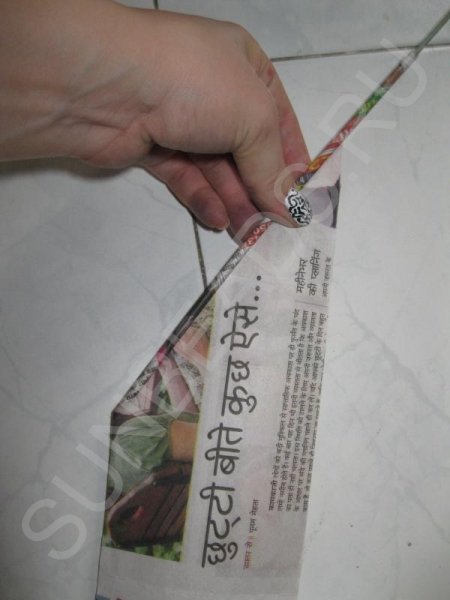 После этого начинается кручение трубочек. Полоска газеты размещается вертикально, а спица устраивается в верхнем левом углу под наклоном.