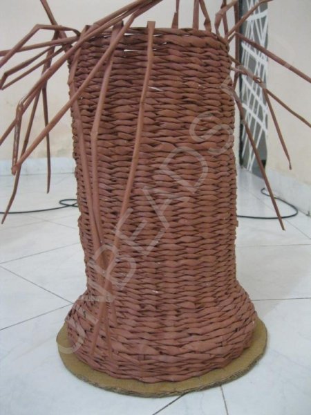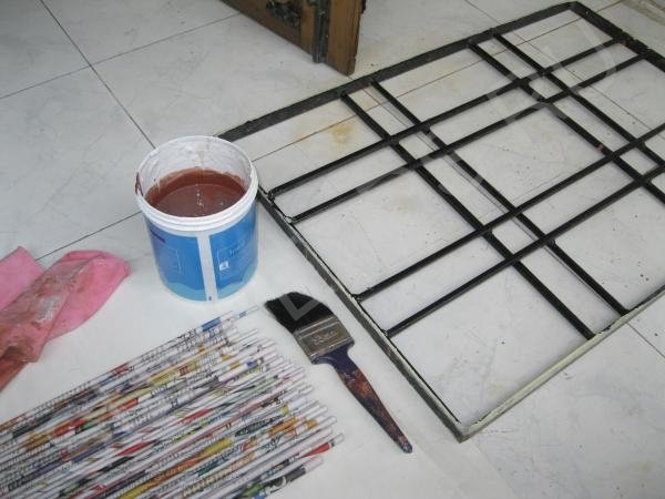 После этого трубочки необходимо покрасить, хотя это не обязательно: покрыть краской можно и по окончании работы, но предварительно окрашенные трубочки наделяют изделие более презентабельным видом. В данном мастер-классе для придания палочкам коричневого цвета была использована акриловая грунтовка и колер коричневого цвета.