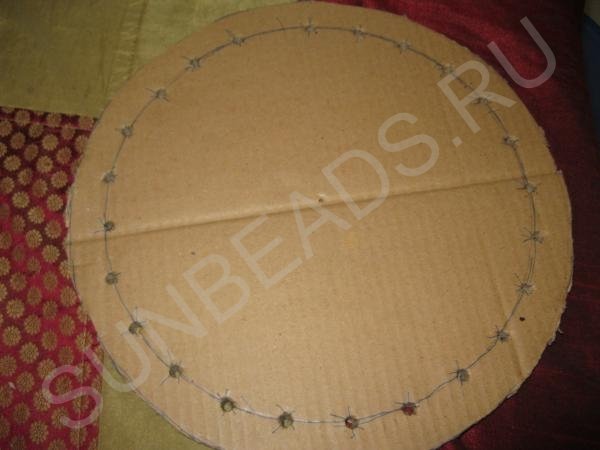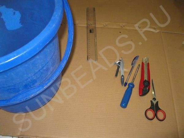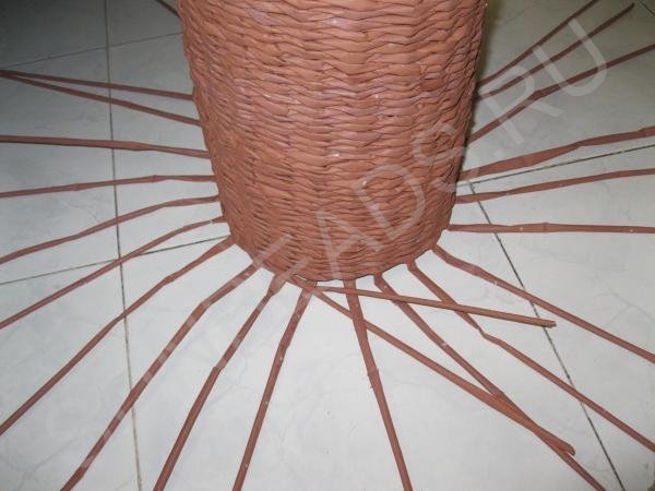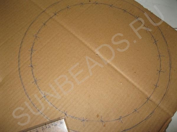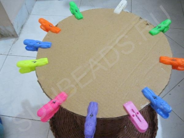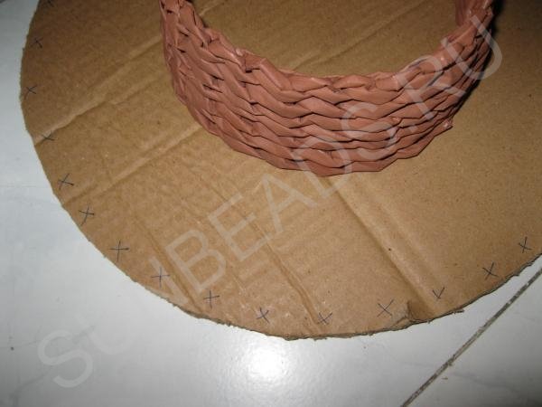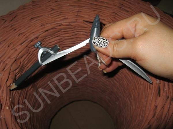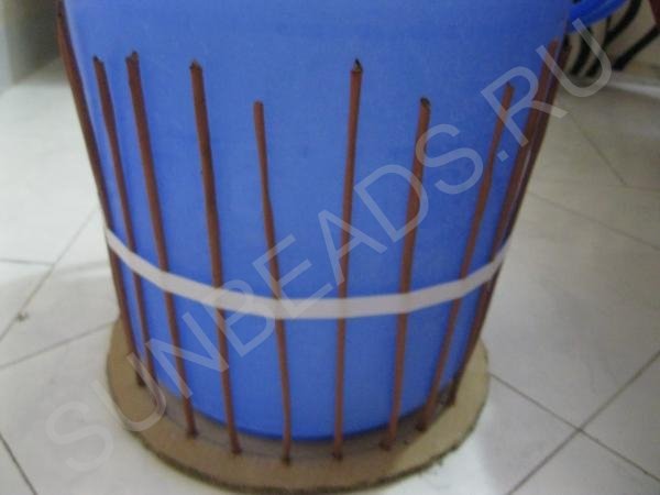 Ведро используется в начале плетения для создания ножки. По периметру картонного круга (на внутренней окружности) на равном расстоянии отмечаются точки, где в дальнейшем будут размещаться стоечки.