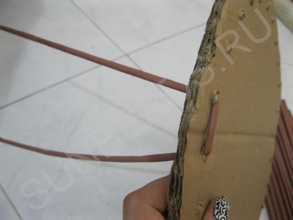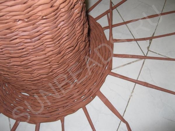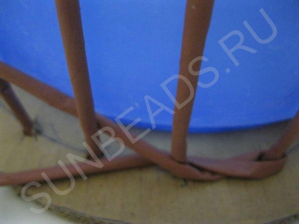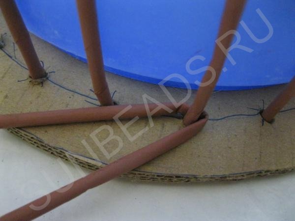 Концы стоечек прячутся следующим образом: на внутренней стороне крышки, непосредственно за стоечкой, спицей отклоняются несколько рядов веревочки и в образованное отверстие просовывается соседняя стоечка. И так по кругу:
