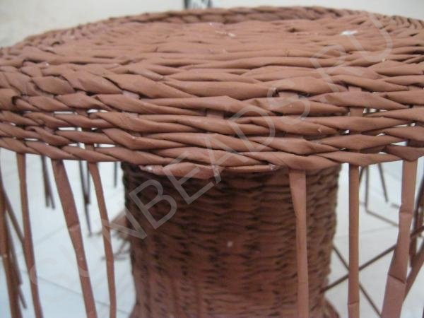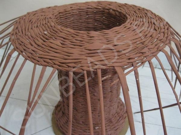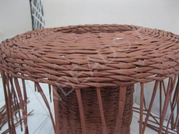 После того, как столешница необходимого размера сплетена, столик снова переворачивается, а стоечки опускаются вниз, после чего оплетаются еще несколько рядов. Это делается для того, чтобы столешница была крепкой. Немаловажным фактором является также и эстетическая составляющая: так столик смотрится красивее. Плетение опять же по принципу «прямая веревочка»: