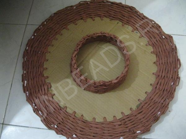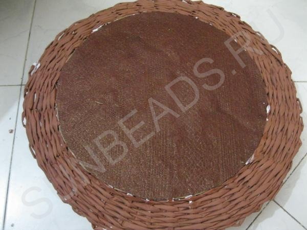 Пока трубочки сохнут необходимо приготовить основу для будущего столика. Для этого из гофрированного картона вырезается круг, диаметр которого равняется диаметру емкости (в данном случае ведра).