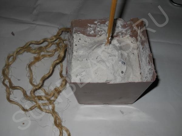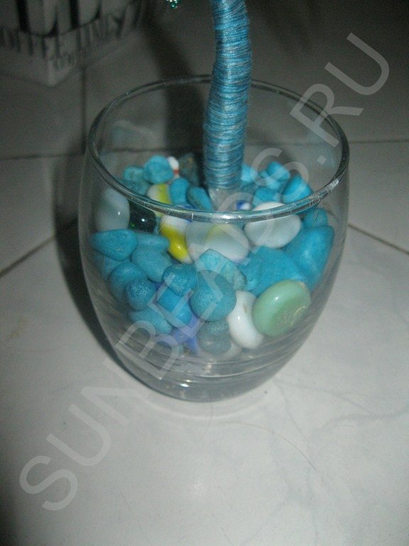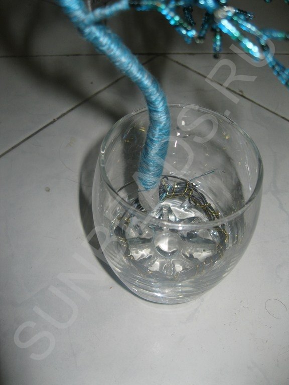 Теперь устанавливаем всю конструкцию в емкость. В данном мастер-классе использовался надтреснутый стакан. Можно также взять стаканчик от йогурта, маленький вазончик или другую емкость. Установить дерево можно различными способами: можно залить его раствором с алебастром, или же, как в данном уроке, использовать горячий клей.