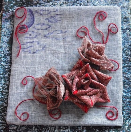- Бисер. В этой работе использовался материал трех цветов, причем нанизывали его без всякого порядка хаотично.