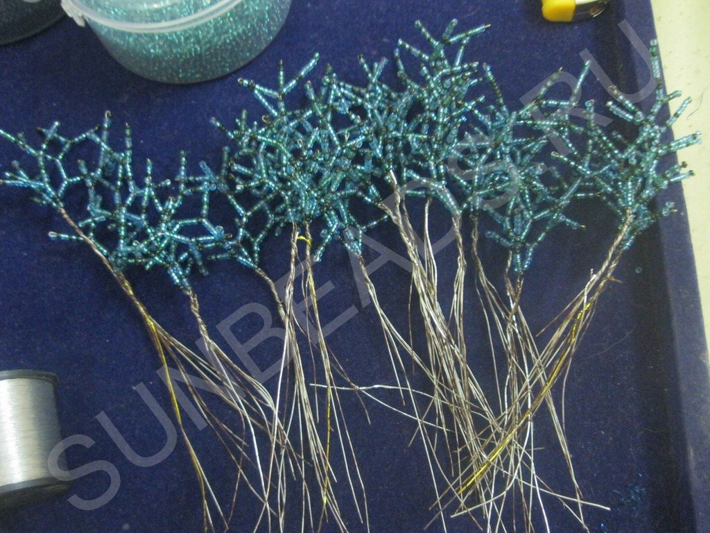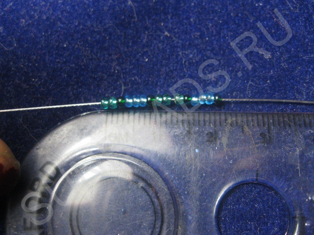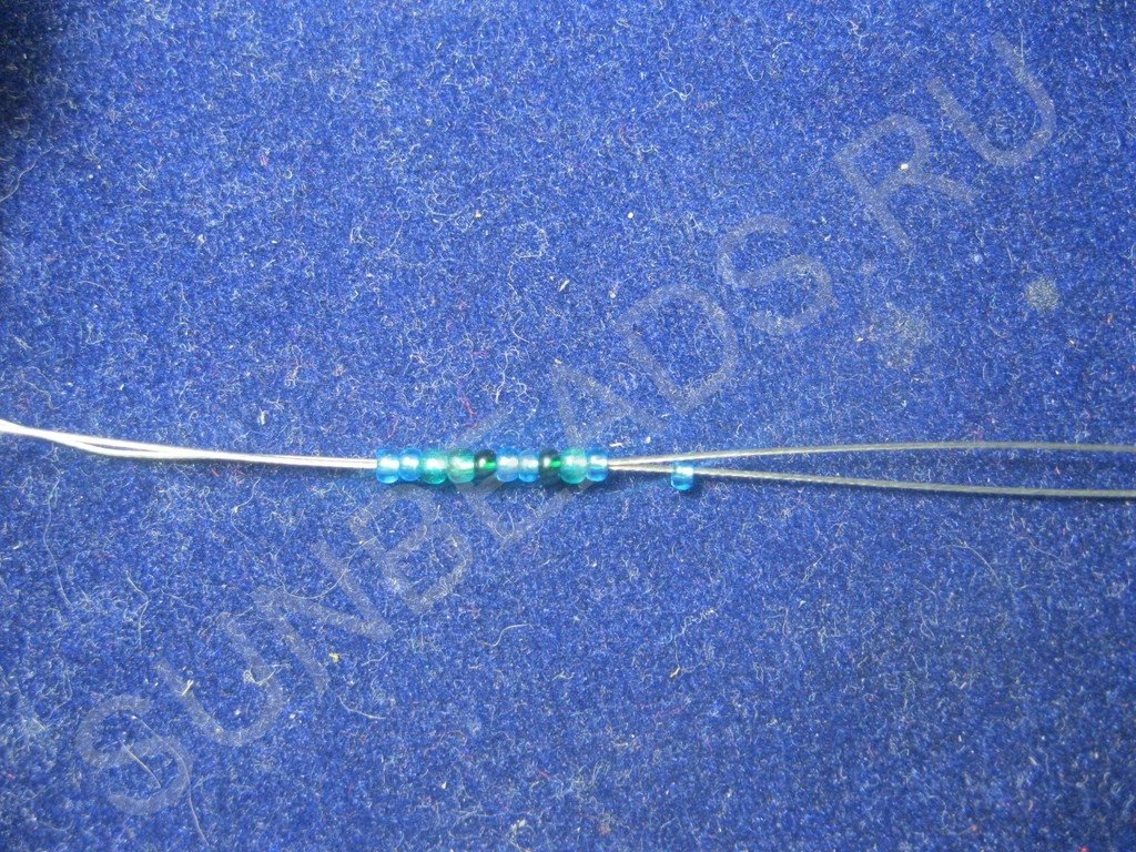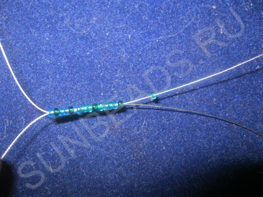 И пропускаем свободный конец через эти бисерины, при этом не трогая самую крайнюю (первую) из них: