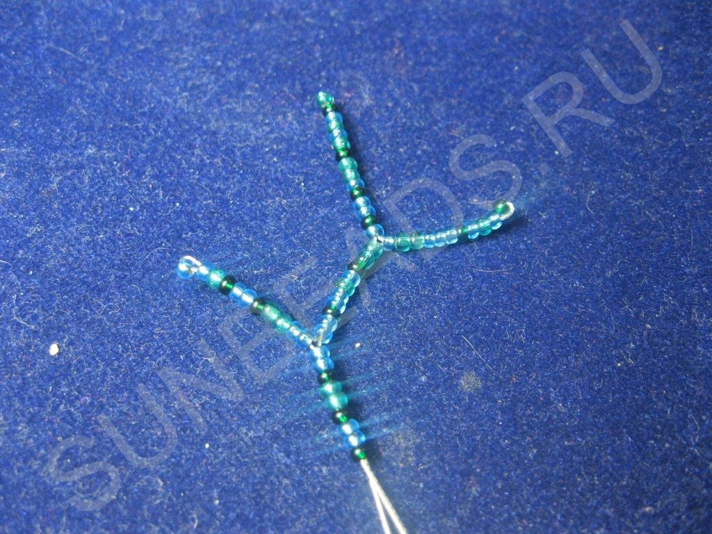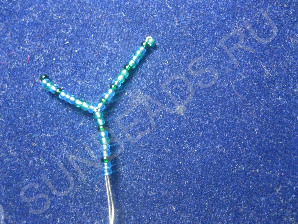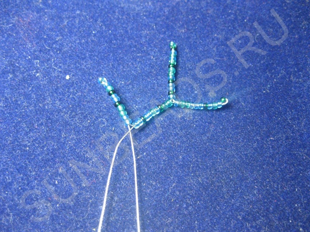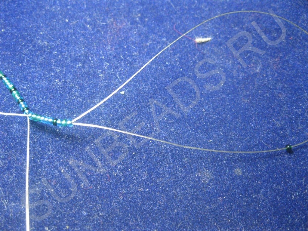 Снова повторяем: на свободный кончик нанизываем бисер, затем пропускаем обратно: