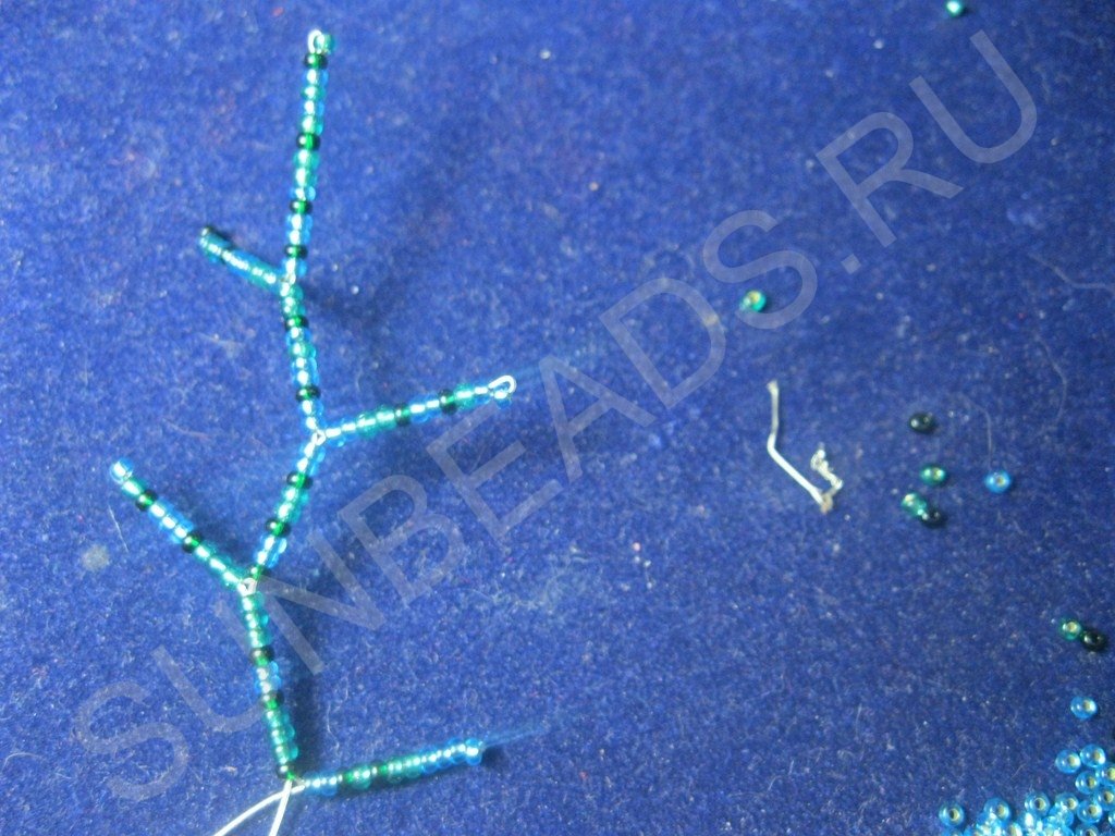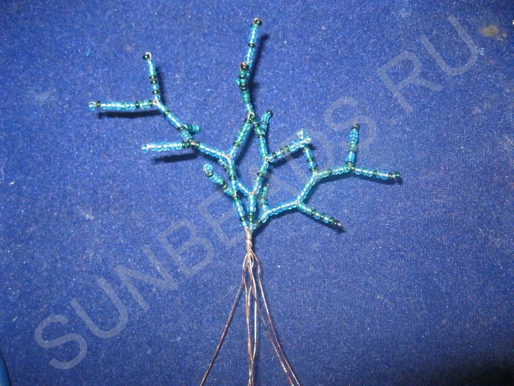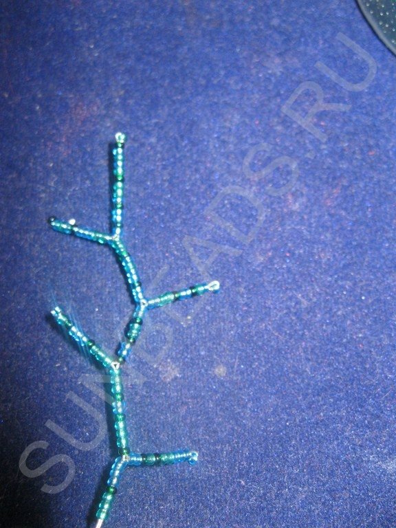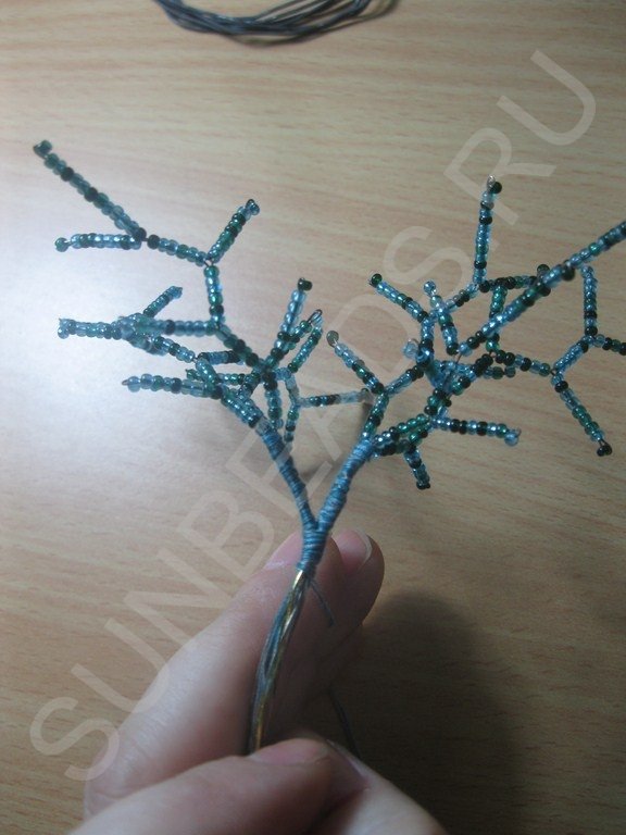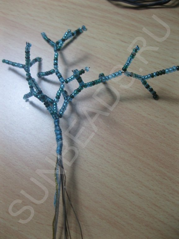 Недотягивая жгута, проходим через бисер, расположенный на другом конце, и уже затягиваем проволоку. Получается вот такая веточка с четырьмя ответвлениями: