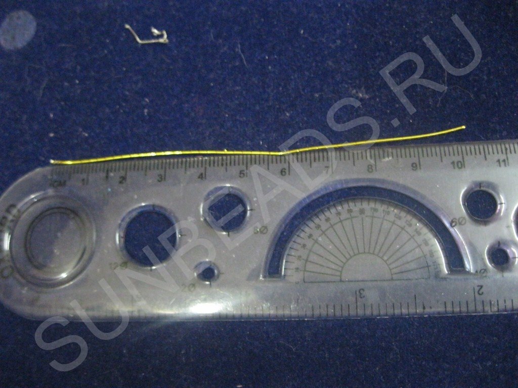 На тонкую проволоку, не отрезанную от всей катушки, нанизываем бисер. Примерно 50-60 см материала будет достаточно. Затем отодвигаем бисер вниз по катушке еще на 30-40 см. Тот кончик, который свободный, непосредственно будет участвовать в рабочем процессе. Отмеряем два сантиметра бисера: