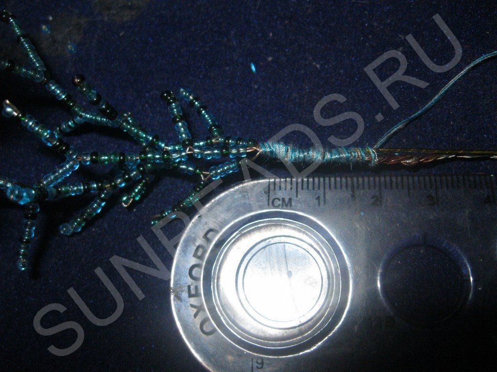 Получилась конечная ветка, состоящая из двух второстепенных веток. Таким же образом формируем еще одну конечную ветку. Однако обматывать ее нужно на 3 см вниз. Нитку не отрываем и прикладываем первый уже сформированный элемент: