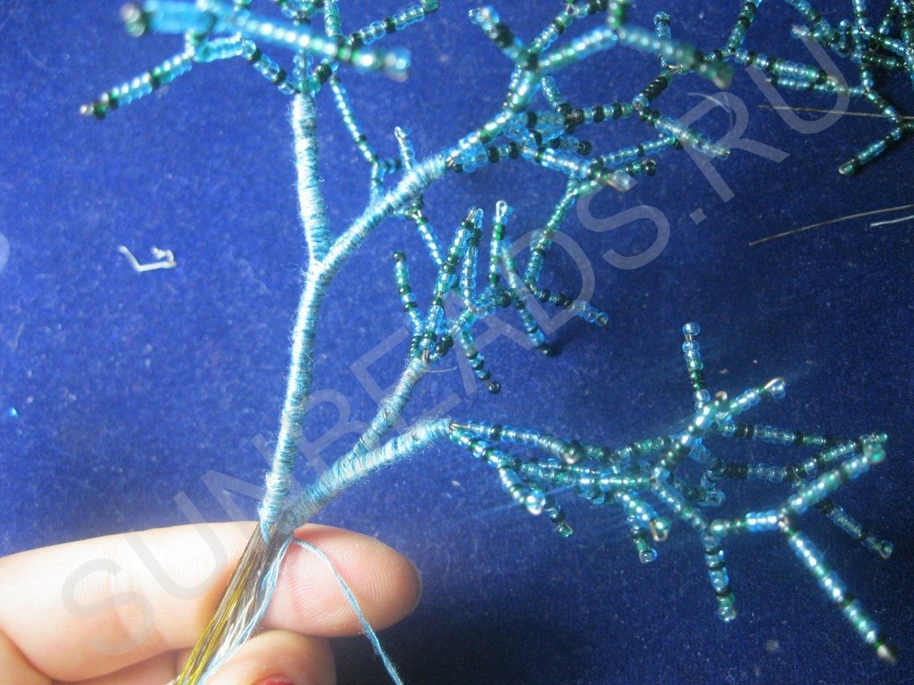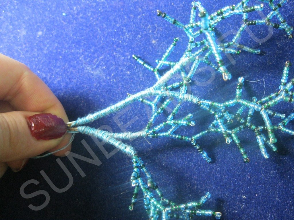 Делаем еще одну конечную ветку, состоящую из двух второстепенных веток. Присоединяем ее к уже образованной конечной ветке и обматываем вместе на 0,5-1 см. Это верхушка. Кончики верхушки раздвигаем и устанавливаем всю конструкцию на каркас, при этом нить не обрезаем. После продолжаем оплетение нитью на пару сантиметров вниз.
