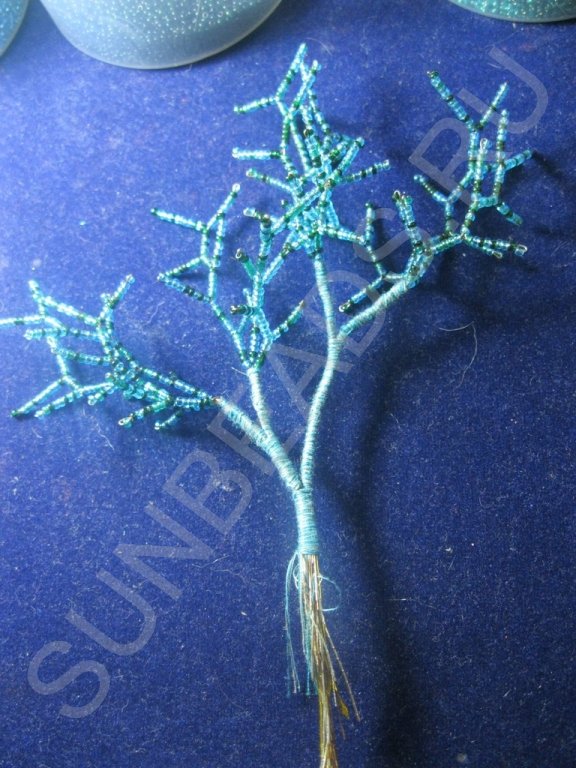 Затем нитку отрезаем и закрепляем ее между кончиками проволоки. Получается второстепенная веточка, состоящая из трех веток-заготовок: