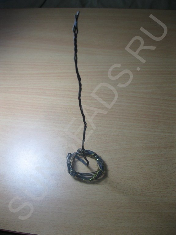 Для дальнейшей работы необходимо изготовить каркас. С этой целью берем толстую проволоку или скрученную ленту из более тонких элементов, на одном ее конце делаем петлю, чтобы конструкция стояла прочно, с другой стороны формируем острый кончик. Если же проволока с оплеткой, ее необходимо сверху снять (для более плавного и равномерного перехода от верхушки к стволу)
