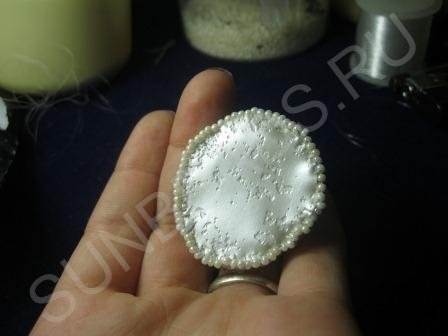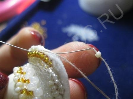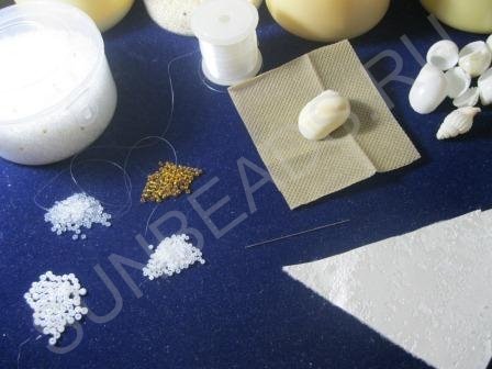 Принимаемся за процесс обшивания главной детали (ракушки) бисером. Методов, используемых для вышивания с помощью бисера огромное количество. В данном уроке была использована схема «иголка вперед».