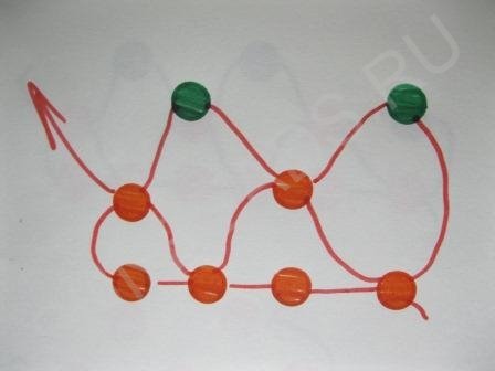 Пронизываем ткань иглой с внутренней стороны наружу. Набираем одну бисерину. Опускаем ее на ткань и смотрим, где она заканчивается. В эту точку направляем иглу и перекидываем ее обратно на внутреннюю сторону ткани. Затем снова выводим нить наружу возле задней стенки бисерины и проходим через отверстие бисерины иглой вперед. Таким же образом крепим все остальные шарики. При этом за один раз можно набирать также два элемента.