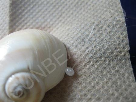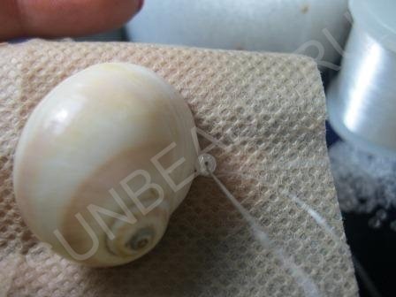 Первый элемент готов. Присоединяем к нему вторую и последующие бисеринки. ВНИМАНИЕ! Для того чтобы оплетение ракушки с помощью мозаики было аккуратным и красивым, количество бисерин в первом ряду должно быть нечетным.