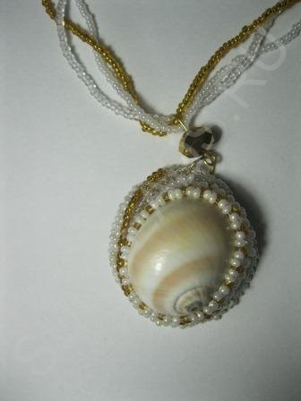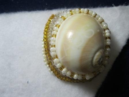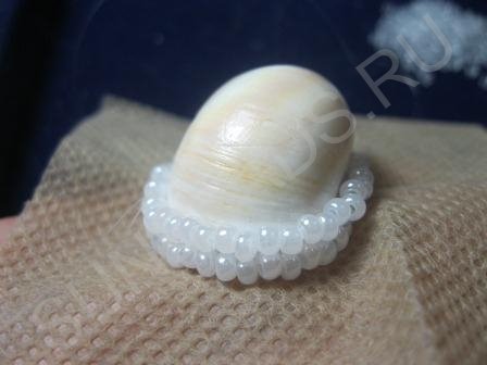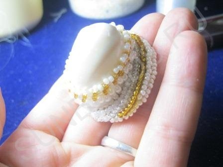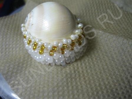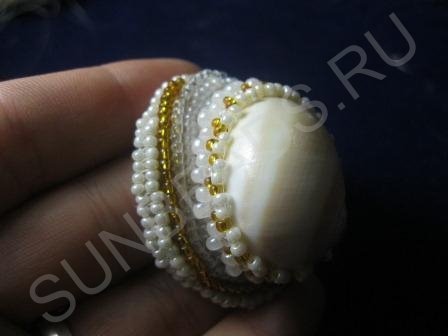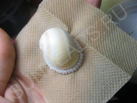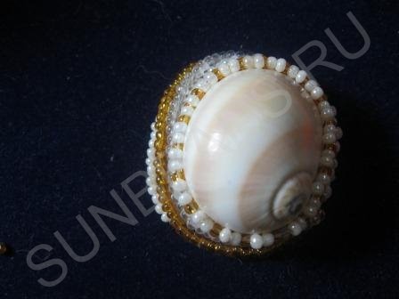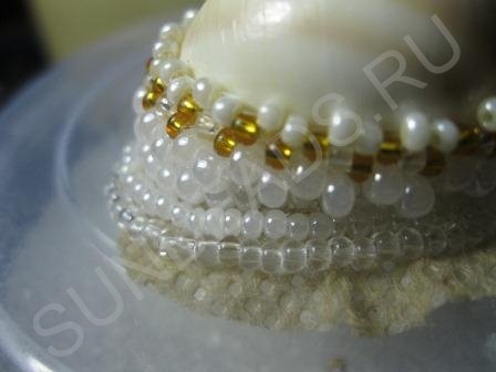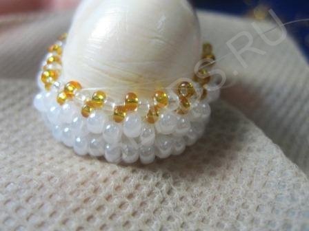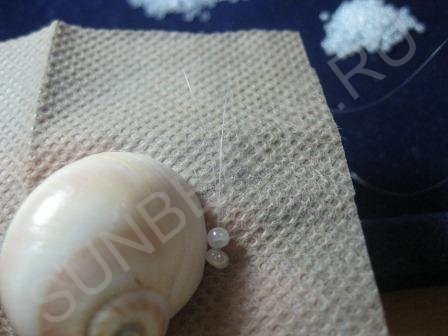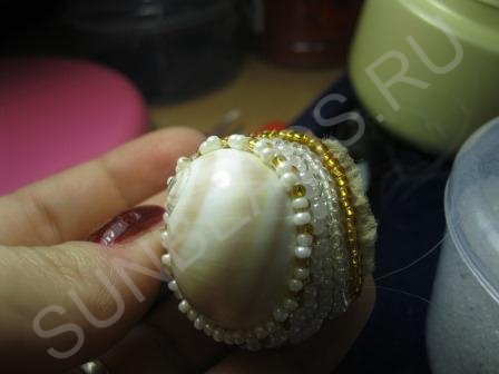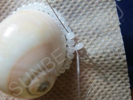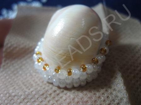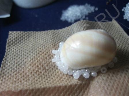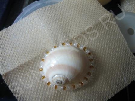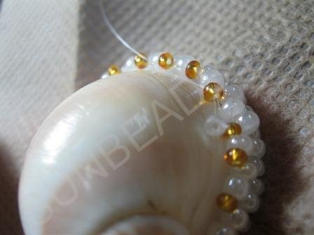 Теперь приступаем к вышиванию пространства вокруг ракушки. Аналогичным, как и при выполнении первого ряда оплетения, способом пришиваем бисеринки:
