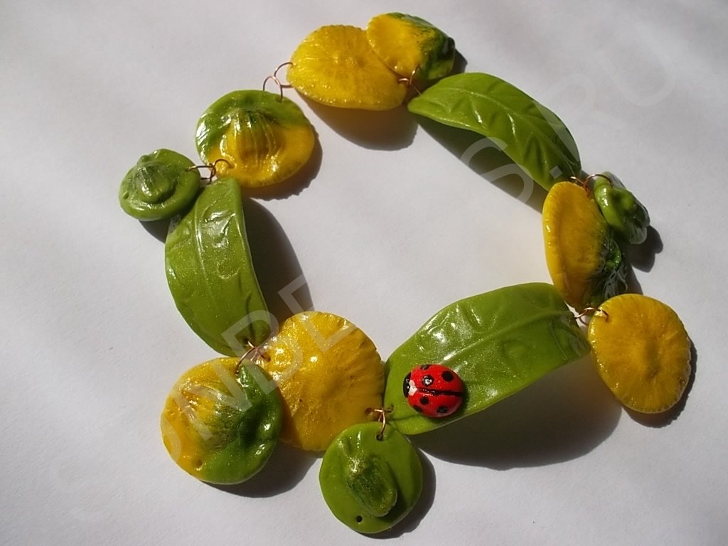 Слепить просто круглые шары нам показались не очень интересной затеей поэтому, пришла идея сделать слепки листьев и цветов на разной стадии роста и раскрытия бутонов. На слепках, то есть молдах, отпечаталась каждая прожилка листа и каждый лепесток и тычинка этого простого и милого цветка. Добавить браслету ручной работы живости и немного разбавить цветовую палитру нам помогла маленькая божья коровка, уютно притулившаяся на листочке. Как и сам браслет, сделать ее совсем несложно.