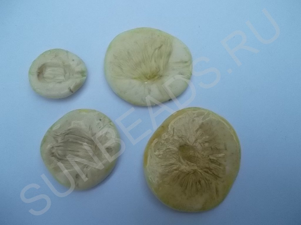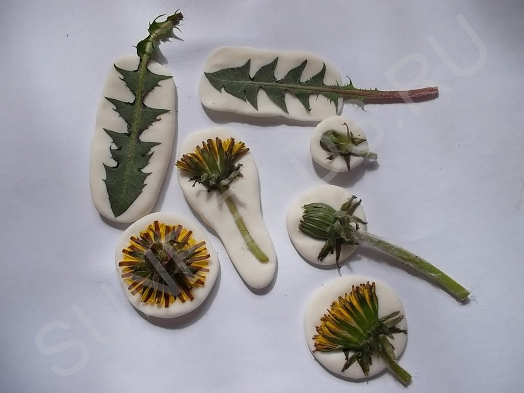 - Аккуратно снимаем одуванчики. Если на слепке останется пыльца или какие либо посторонние вкрапления, не спешите их удалять, максимальная натуральность, вот что нам требуется. Теперь молды почти готовы, осталось только дать им хорошо застыть или, согласно инструкции на упаковке пластики, запечь в духовке.