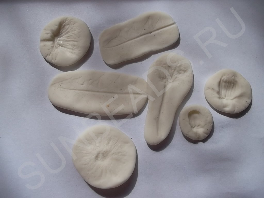 - Самодельную или покупную пластику хорошенько разминаем в руках и формируем из нее несколько плоских кусочков. Размещаем на них по отдельности цветы и листья. Нам не нужна идеально ровная поверхность с отпечатком поэтому, нажим осуществляем пальцами или ладонью.