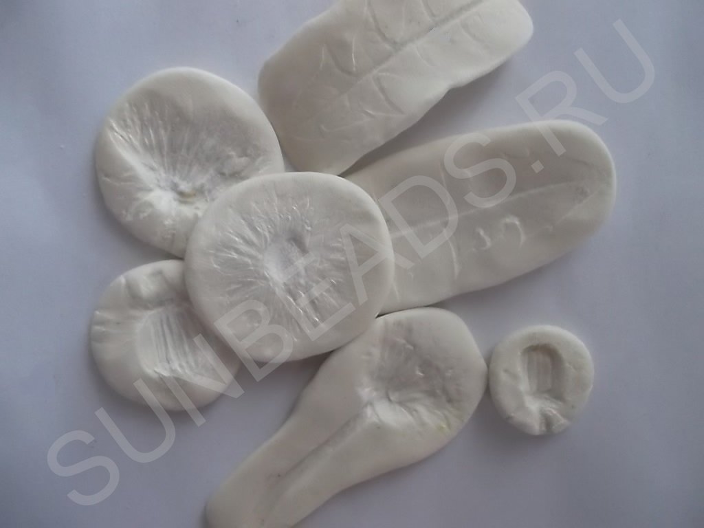 - Разравниваем полимерную глину на молдах и осторожно ее с них снимаем. Целесообразнее это делать, начиная поднимать края по всему периметру, даже если они немного помнутся, их всегда можно подправить, что не удастся сделать с отпечатком самого цветка.