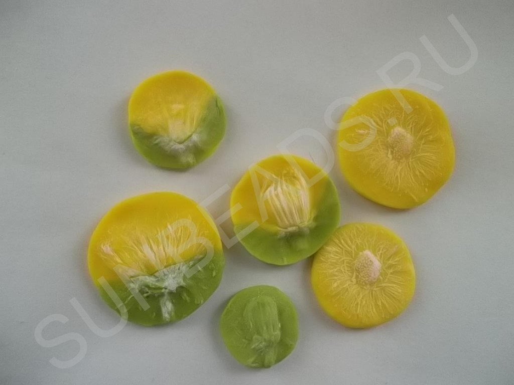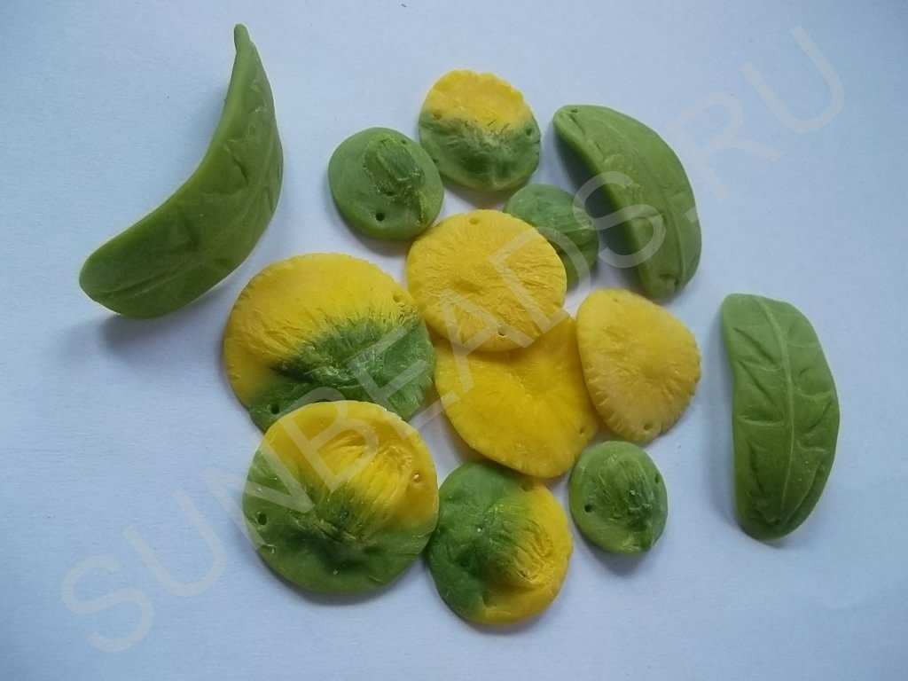 - На слепки листьев и закрытых бутонов кладем пластины из материала зеленого цвета, на слепки раскрывшегося цветка желтого, а вот на молды не распустившихся цветов, кладем оба цвета вместе. Причем зеленый, должен разместиться именно там, где и расположено основание цветка.