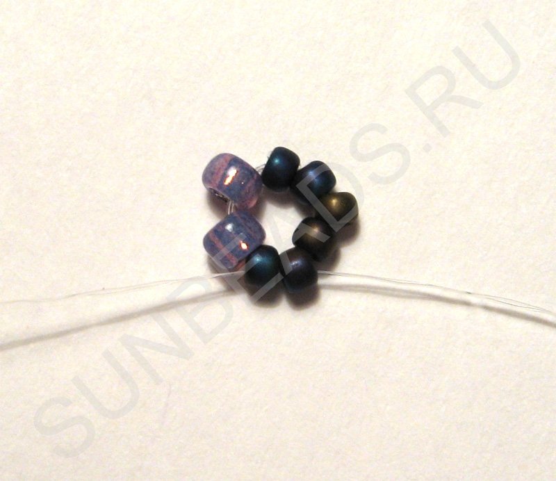 Набираем сначала 4 бисерины 11-го размера, замыкаем в кольцо, а потом набираем бисерину 8-го размера.