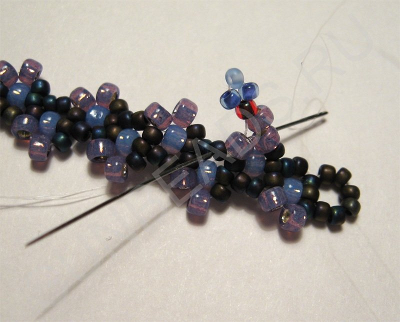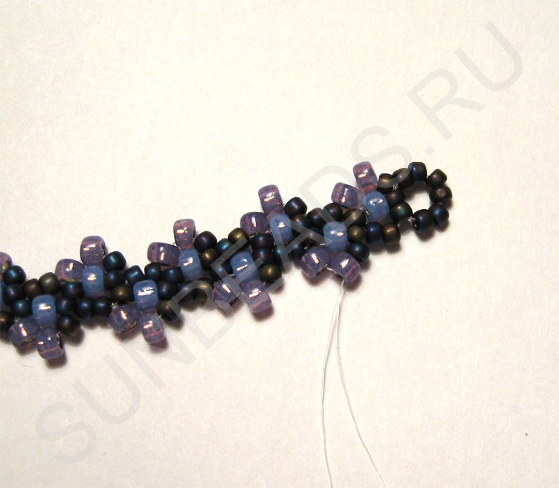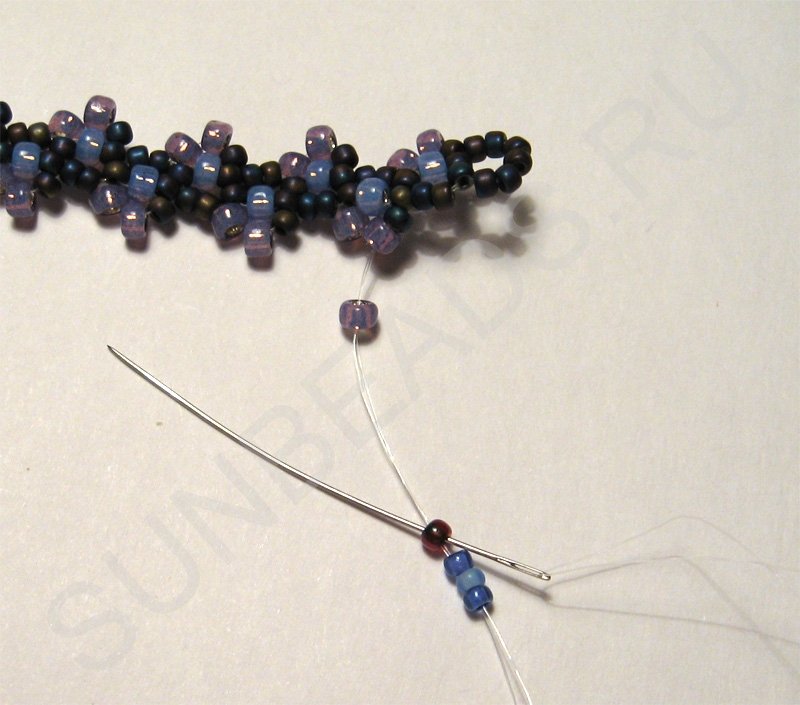 Выводим иглу в середине пары круглого бисера 8-го размера: