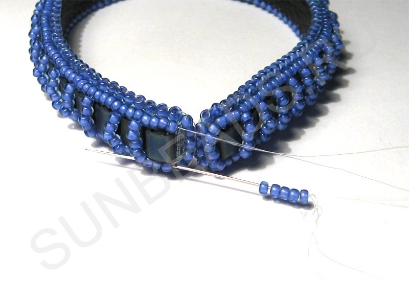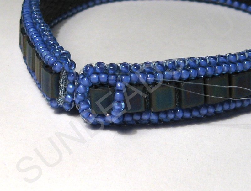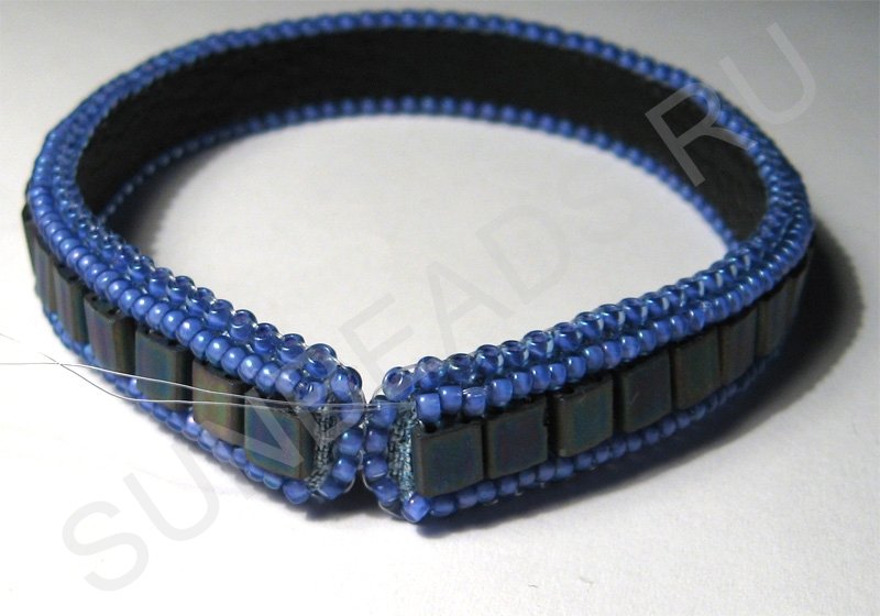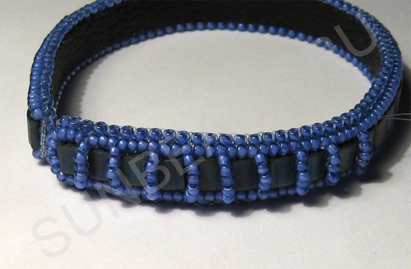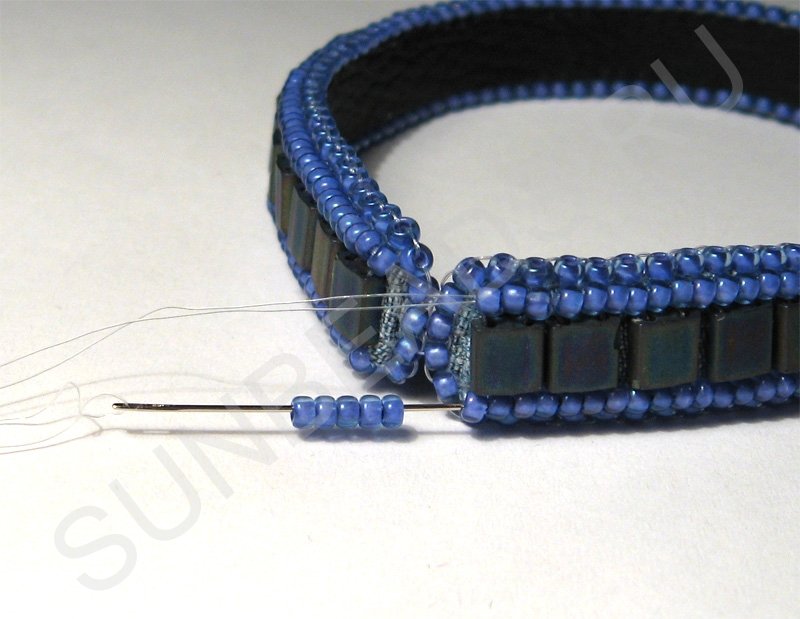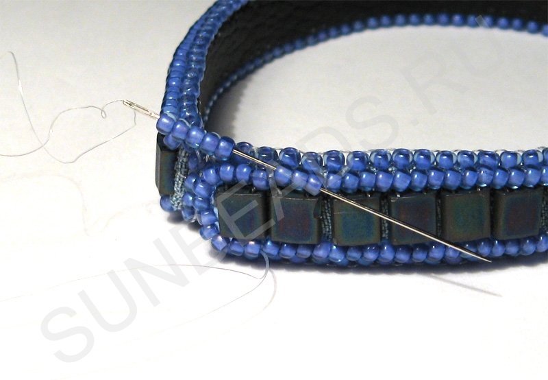 Теперь вдоль плоского бисера пришиваем круглый бисер по одному ряду с каждой стороны.