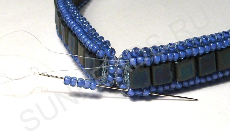 Снова набираем 5 бисерин и вводим иглу в бисерины противоположного ряда. Выводим иглу между двумя плоскими бисеринами.
