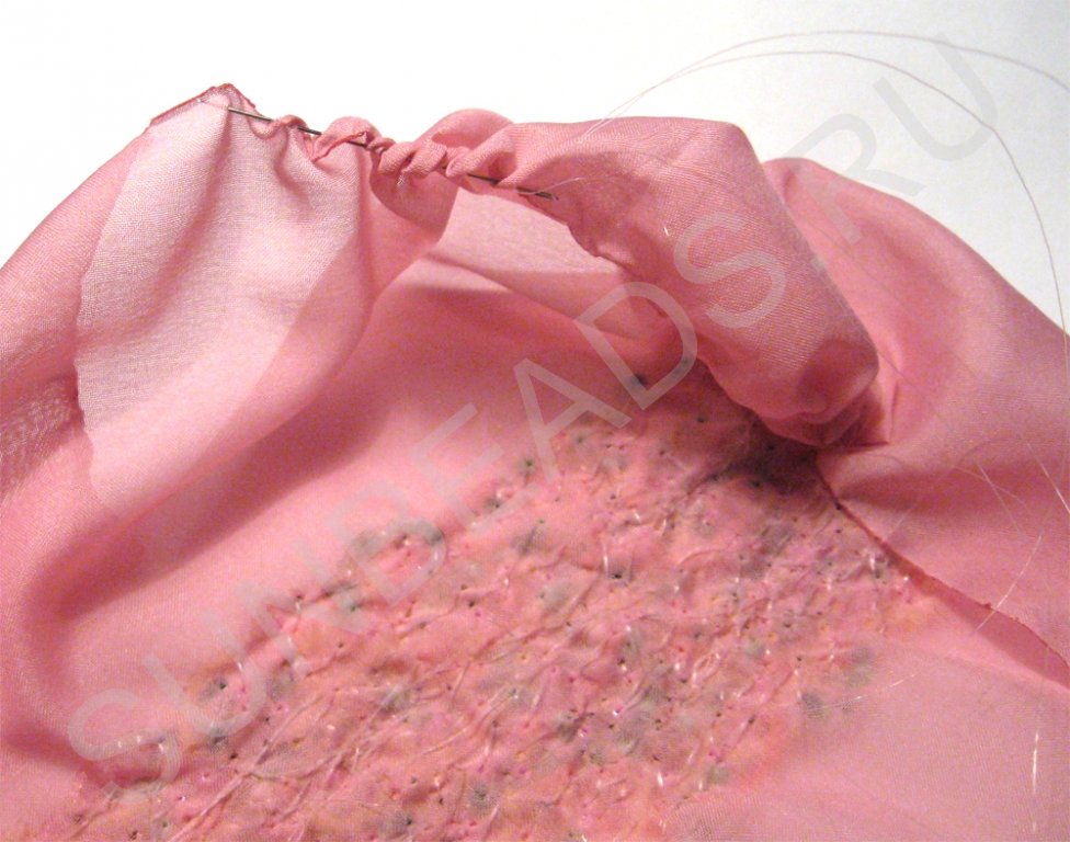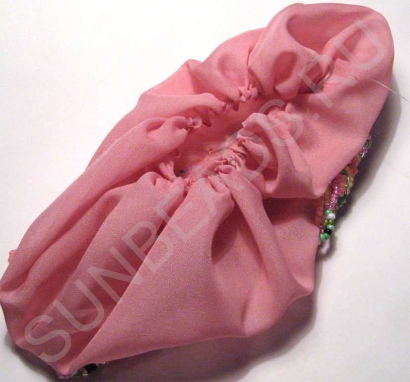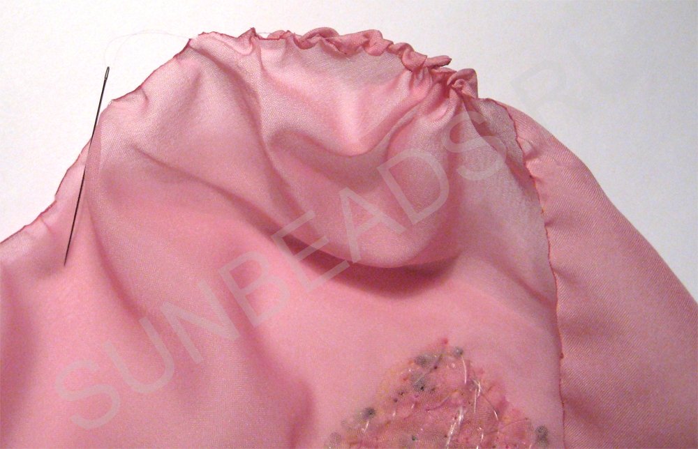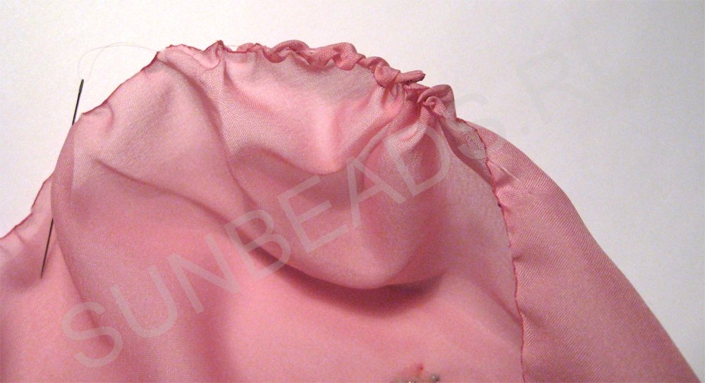 Немного расправим сборку, сделаем посвободнее так, чтобы вокруг бисерной вышивки ткань выступала примерно одинаково.