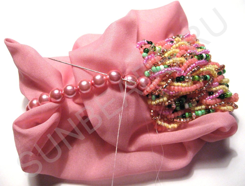 Край жемчужной нити пришиваем к другому торцу бисерной вышивки.