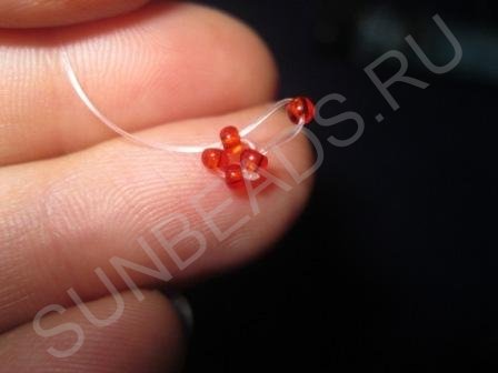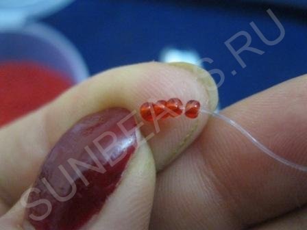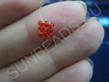 Шаг 1: Согласно первому шагу схемы набираем четыре бисеринки красного цвета: