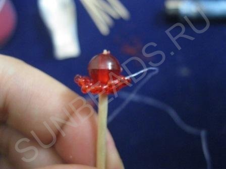 «Надеваем» сплетенное полотно на зубочистку. Сверху помещаем базовую бусину и смотрим, подходит ли по размеру сформированная основа. Если бусина больше, повторяем все с шага 3. Т. е. увеличиваем площадь для покрытия шарика. Если диаметр примерно такой, как нужен, продолжаем плетение уже по бусине. Перекидываем леску в следующую бусину.