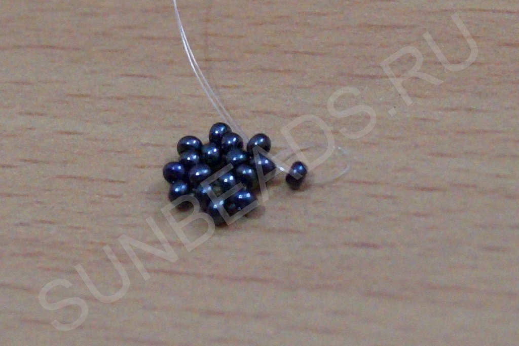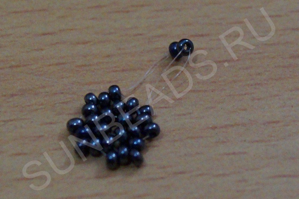 Затем делаем шаг ндебеле. Для этого на нить, выходящую из бисерины второго ряда, нанизываем пару бисерин и вводим иголку в отверстие соседней бисерины второго ряда: