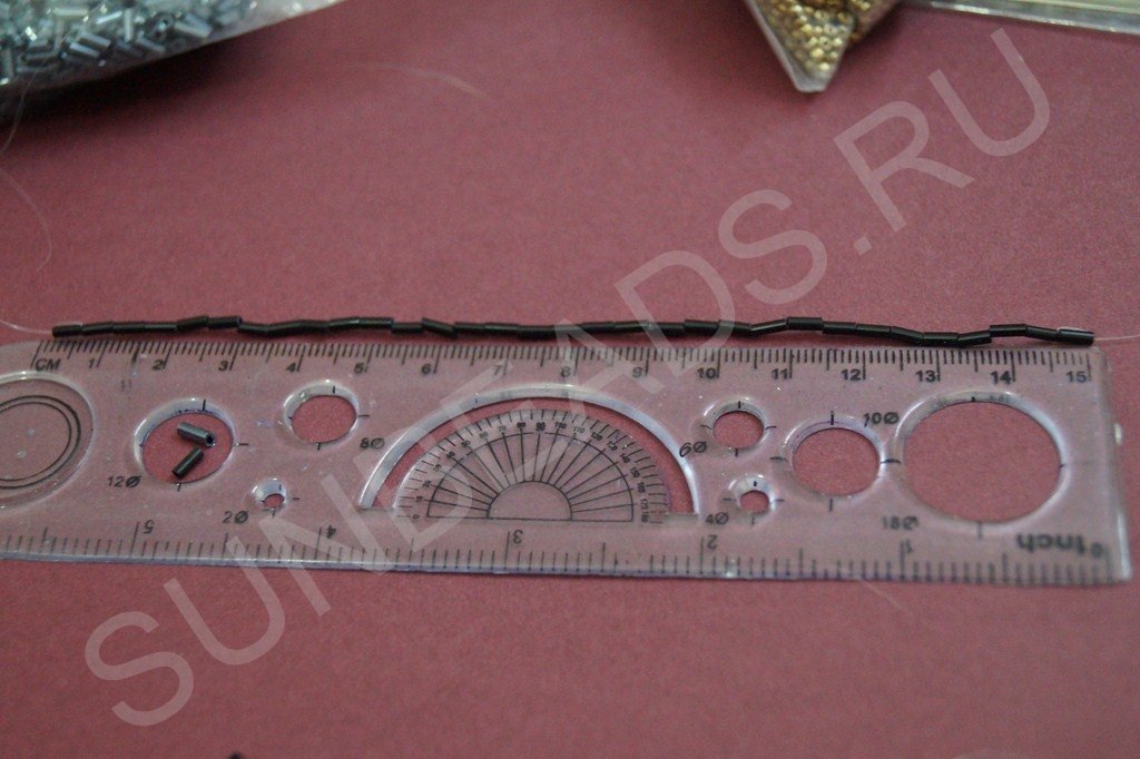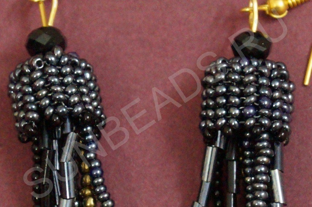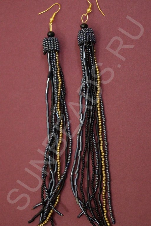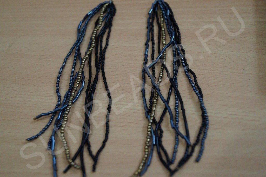 Теперь для наглядности покажем, как эти концевики смотрятся с серьгами. Для этого нанизываем на нить стеклярус (в уроке длина «перьев» достигает 14-15 см):