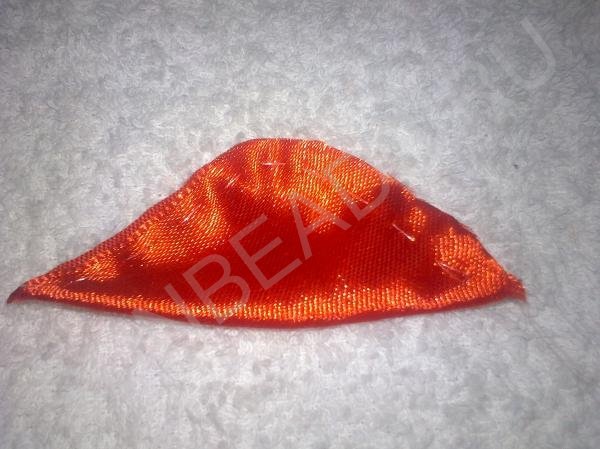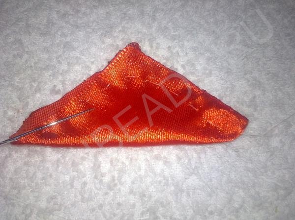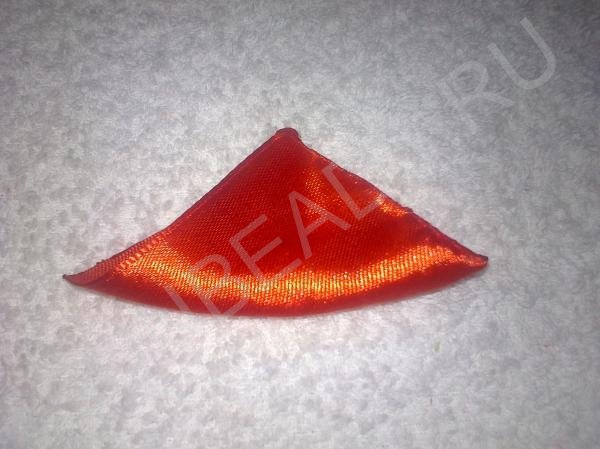 Подготовим заготовки. Из красной ленты вырежьте одинаковые квадратики размером 5 см х 5 см Возьмите квадратик и сложите по диагонали.
