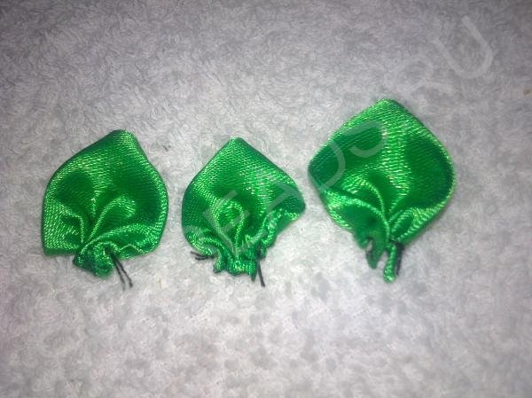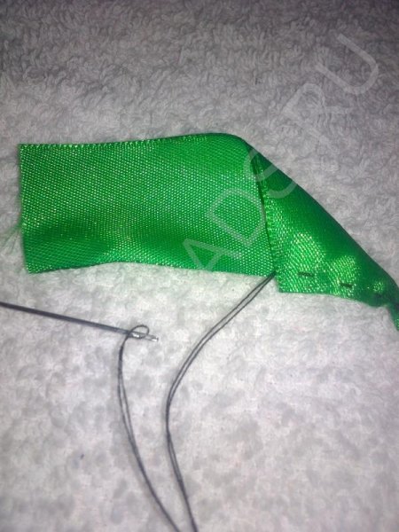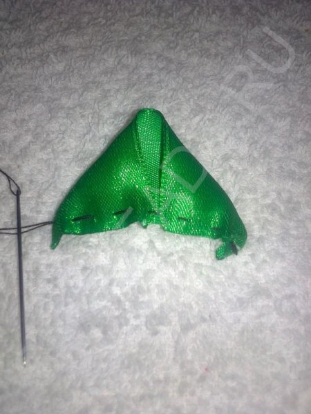Далее сделаем листики для цветка. Из зеленой ленты шириной 2,5 см, обрежьте прямоугольник длиной 10 см Сложите край вниз, чтобы получился треугольный край. Наметайте низ «мелким шагом».