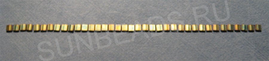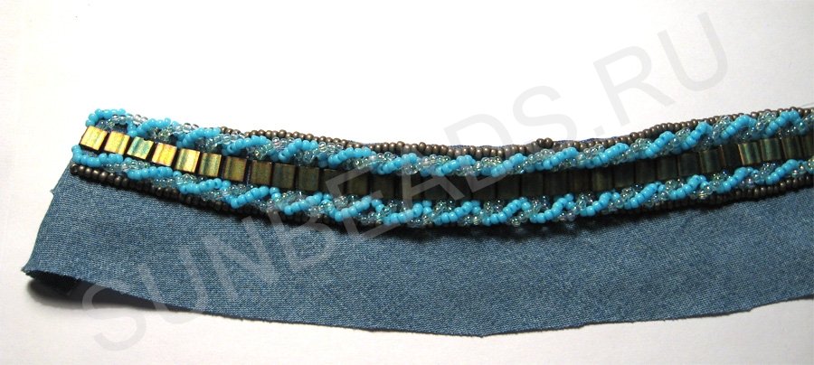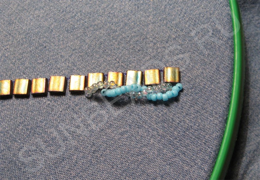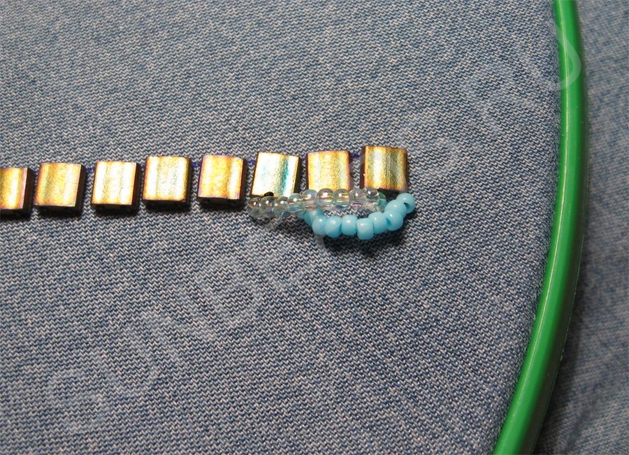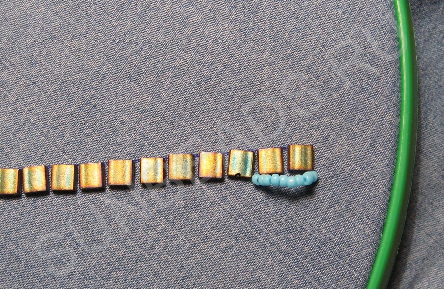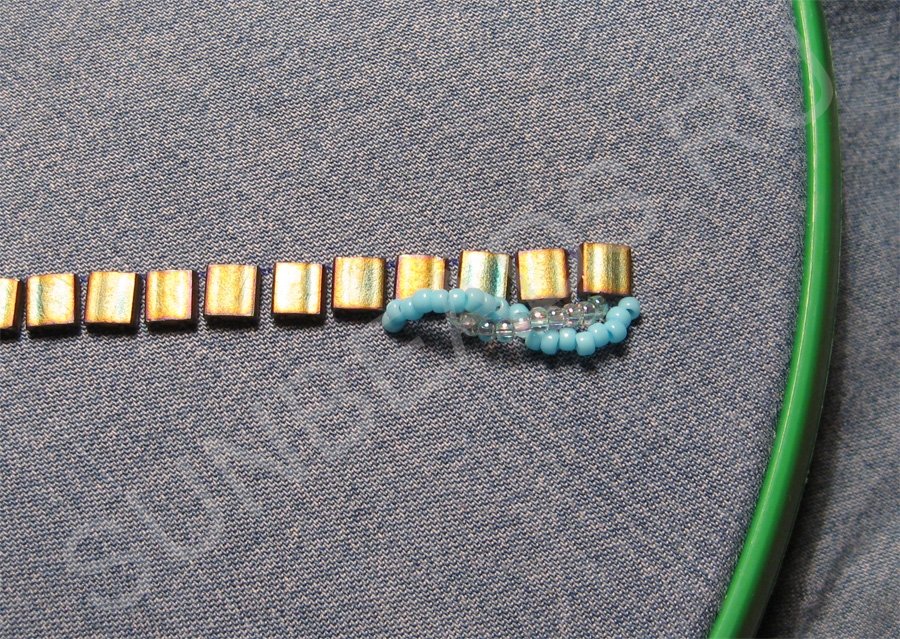 Теперь пришиваем плоский бисер Miyuki Tila около этой линии. Я буду пришивать бисер поперек, так мне удобнее.