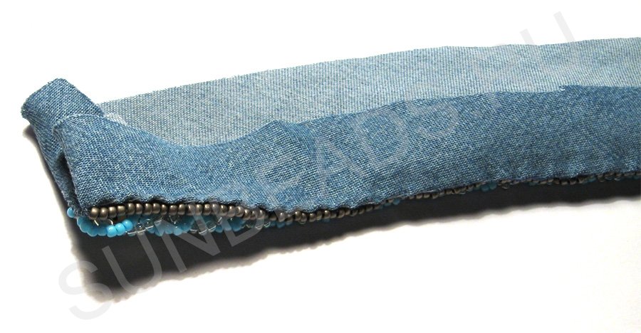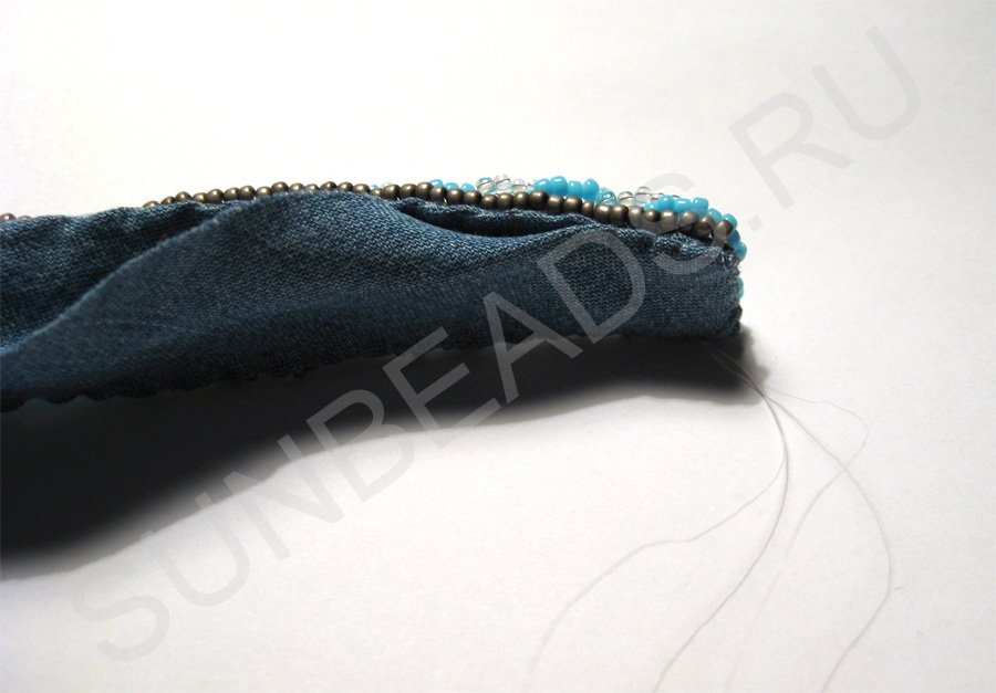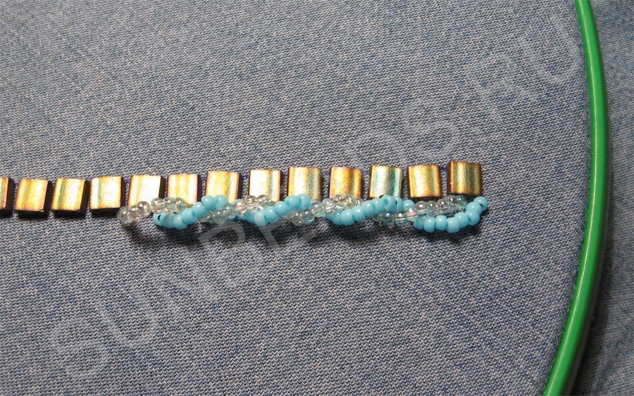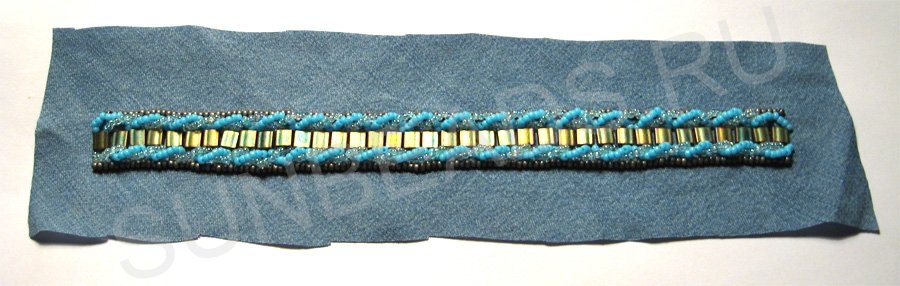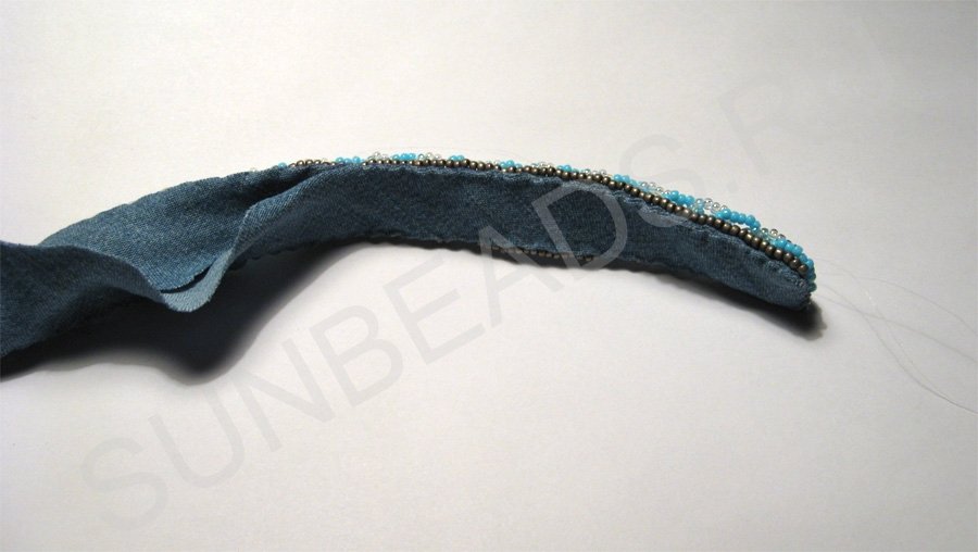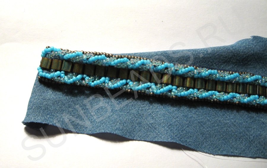 Теперь рядом с бирюзовым бисером с обеих сторон надо вышить прямую линию круглым бисером оттенка старой бронзы.