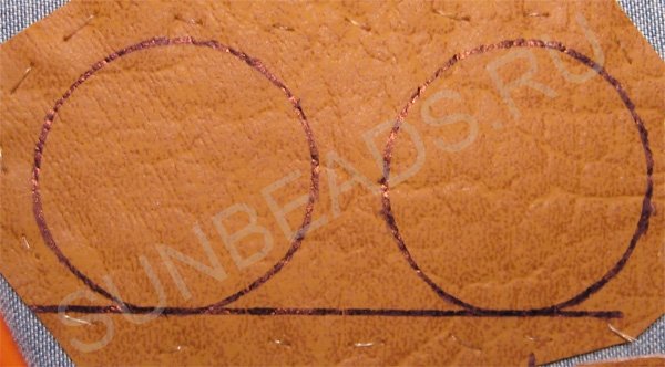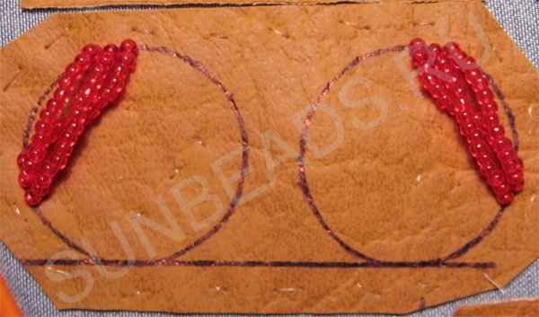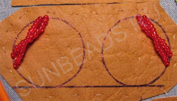 Пришиваем дугу из бисера длиной примерно равной стороне равностороннего треугольника, вписанного в окружность. На втором круге пришиваем такую же дугу, но зеркально: