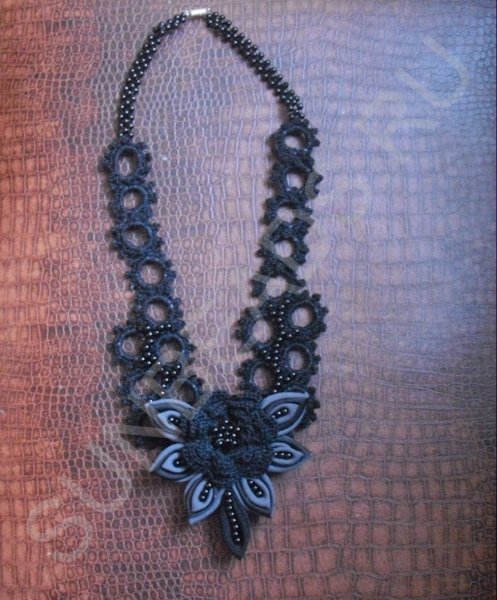 Дальше вам потребуются черные бусины, которыми будет украшаться ожерелье. Сначала вам нужно сделать серединку для вязаного цветка. Она делается из пяти черных бусин, которые следует соединить в кольцо при помощи лески.