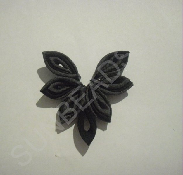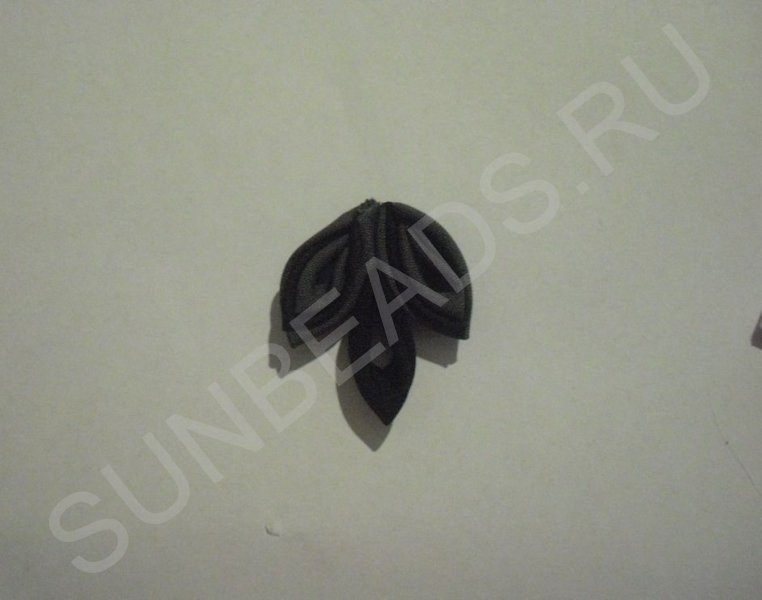 Дальше следует сделать серединку лепестков. Для этого понадобятся маленькие квадраты из серой ткани. Они изготавливаются просто сначала квадрат вам нужно сложить по диагонали для получения треугольника и далее его необходимо складывать пополам еще два раза. Длина и глубина создается таким же образом, как и у больших лепестков, только здесь глубина равна 0,5 см. Остальные маленькие лепестки и отложенный ранее большой черный квадрат следует сложить в такие же лепестки.