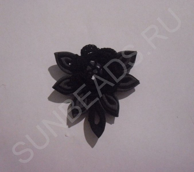 Дальше полученную звездочку вам нужно приклеить в середину вязаного цветка, а в середину каждого лепестка из ткани пришить по три черных бусины, а в длинный черный лепесток потребуется 8 штук.