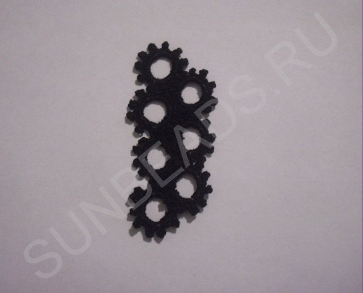 Вязаные колечки делаются из двух рядов из пряжи «ирис» черного цвета. Сначала вам нужно связать крючком 15 воздушных петель и соединить их в кольцо. Второй ряд вяжется из чередования двух столбиков без накидов и пико из трех воздушных петель. В результате получается плотное колечко с узорчатым краем. Дальше точно так же создаются остальные кольца.