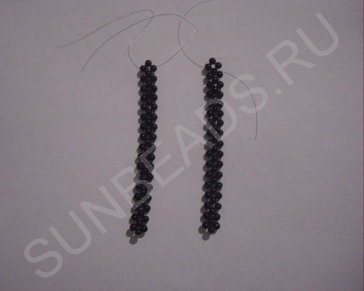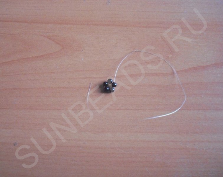 Теперь во втором ряду необходимо между каждой бусиной вплетать еще по одной штучке. В конце ряда леску следует закрепить и отрезать свободную часть.