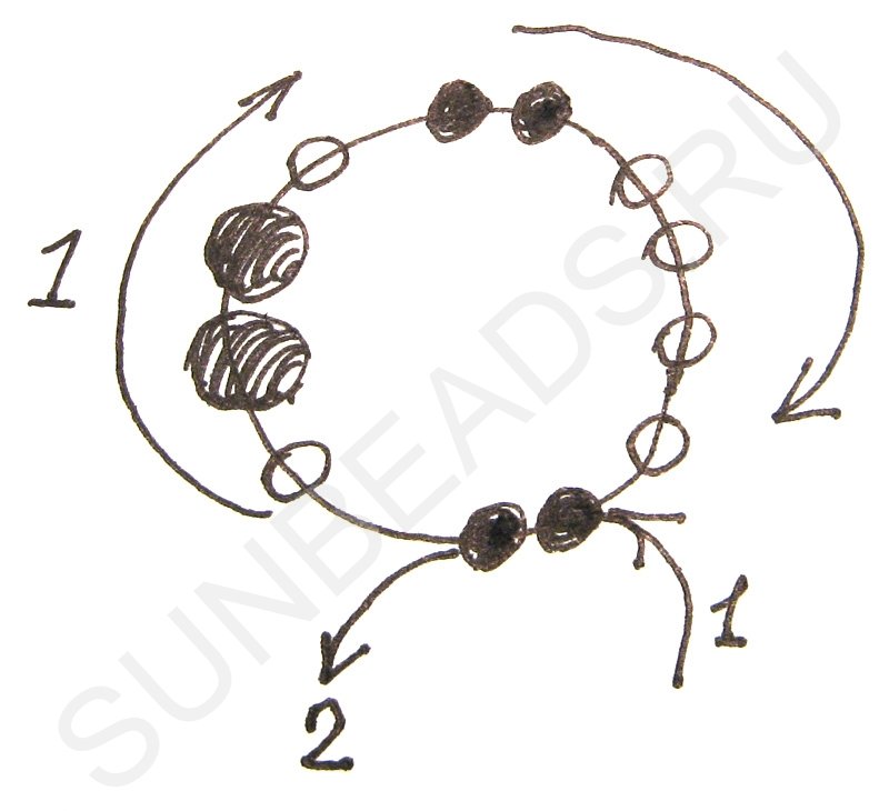 Из бисерного кольца выводим нить между бисерин размера 8.